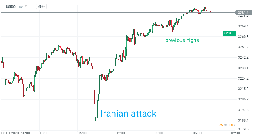 US500 is over 100 points up from the post-Iranian attack lows and any selling pressure at the open was very short lived. In any case, a support created by a previous all-time high of 3263.5 points is very close. Market focus is drifting away from the Middle East and to the next week when the PhaseOne trade deal is about to be signed but also to the start of the earnings season.