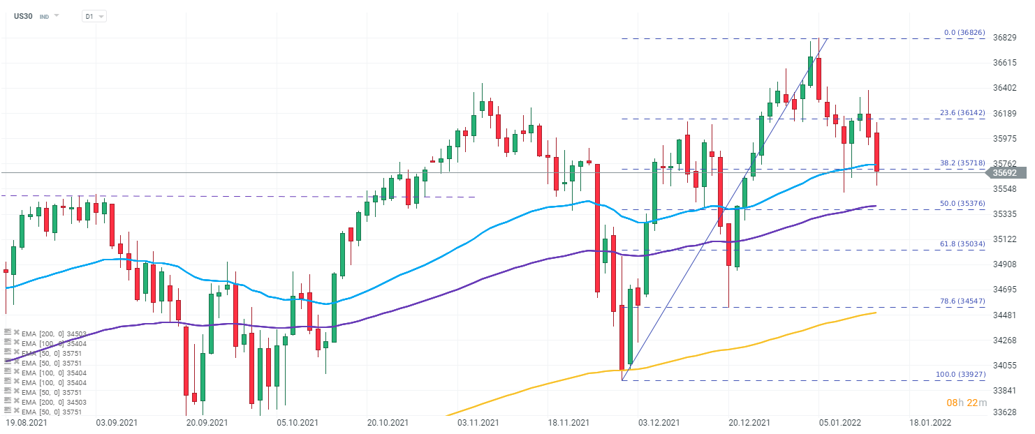 The US30 index is down around 0.6% at the start of today's trading and is testing the support set by the confluence of the 38.2% Fibo retracement and the EMA 50 (blue line). If the supply side manages to continue declines, the next potential level for a rebound is the area of 50% retracement and EMA 100 (purple line). Local resistance remains near 36,100 points. Source: xStation 5