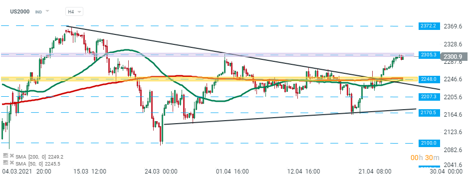 US2000 is currently testing major resistance at 2305.3 pts. Should break higher occur, then upward move may be extended to the next resistance at 2372.2 pts. However in case buyers will fail to uphold momentum, then nearest strong support lies at 2248 pts. Source: xStation5