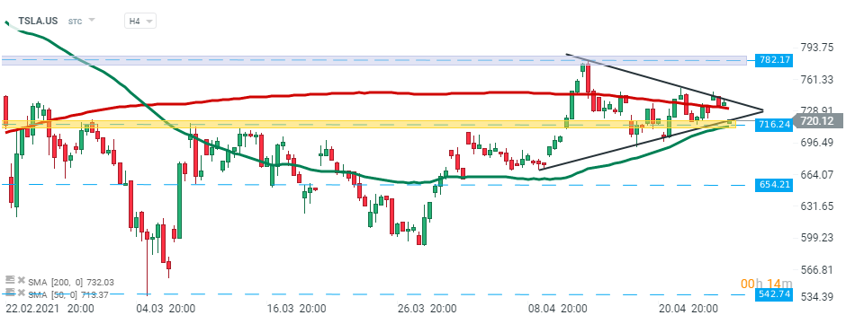 Tesla (TSLA.US) stock dropped 2% in premarket and is currently testing the lower limit of the triangle formation. Should break lower occur then another downward impulse towards support at $654.21 could be launched. On the other hand, if buyers will manage to halt decline here, then upward move may accelerate towards resistance at $782.17. Source: xStation5
