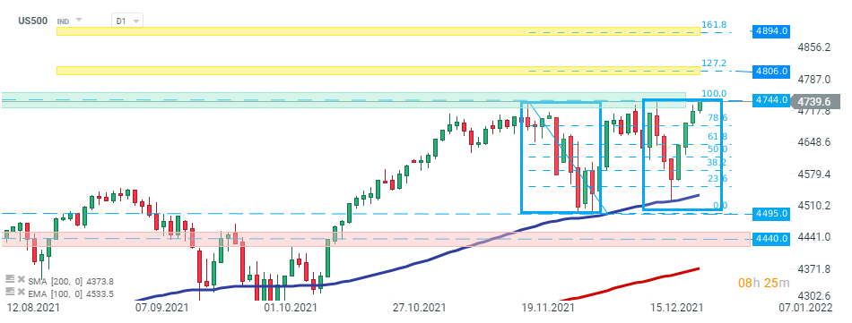 US500 bounced off the EMA 100 (purple line) last week and managed to erase all of the recent losses. Currently the index is approaching its all-time high at 4744 pts which coincides with the upper limit of the 1:1 structure. Should break higher occur, the next target for buyers is located around 4806 pts which coincides with 127.2% external Fibonacci retracement of the recent correction. On the other hand, if sellers manage to regain control, then nearest support lies at 4495 pts. Source: xStation5