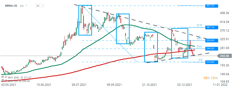 Moderna (MRNA.US) stock launched today's session lower and is testing the lower limit of the triangle formation. If current sentiment prevails, downward move may accelerate towards support at $210.80. Source: xStation5