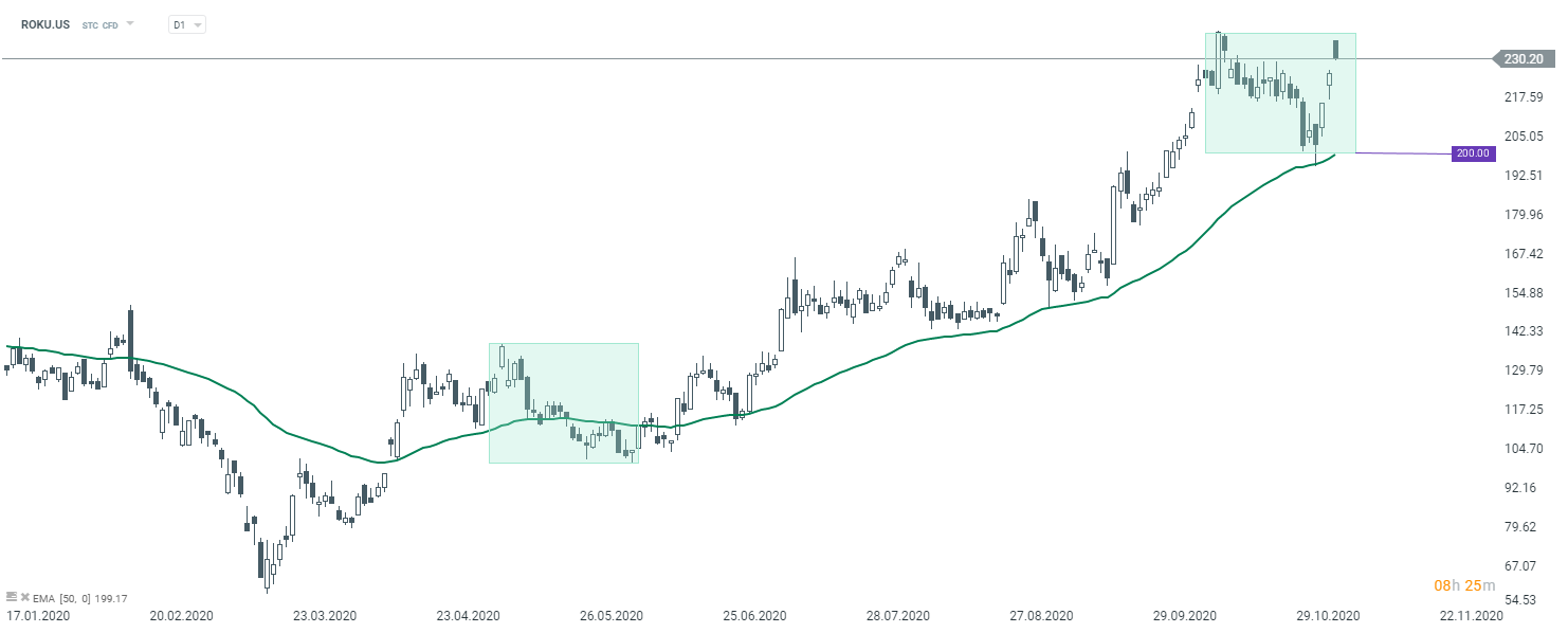Roku (ROKU.US) stock bounced off the support level resulting from 1:1 structure as well as EMA 50. As long as the price remains above the $200 level, an upward trend should be viewed as the baseline scenario. Source: xStation5