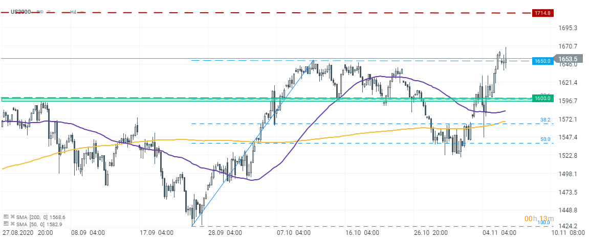 US2000 has climbed above the 1,650 pts mark and is now looking at pre-pandemic highs near the 1,714 pts. Key long term area may be found at 1,600 pts (23.6% Fibo retracement) and it might be viewed as an important support should moods deteriorate. Risk-on gained amid NFP report release as well as Biden’s lead in two critical swing states (Pennsylvania and Georgia). Source: xStation5