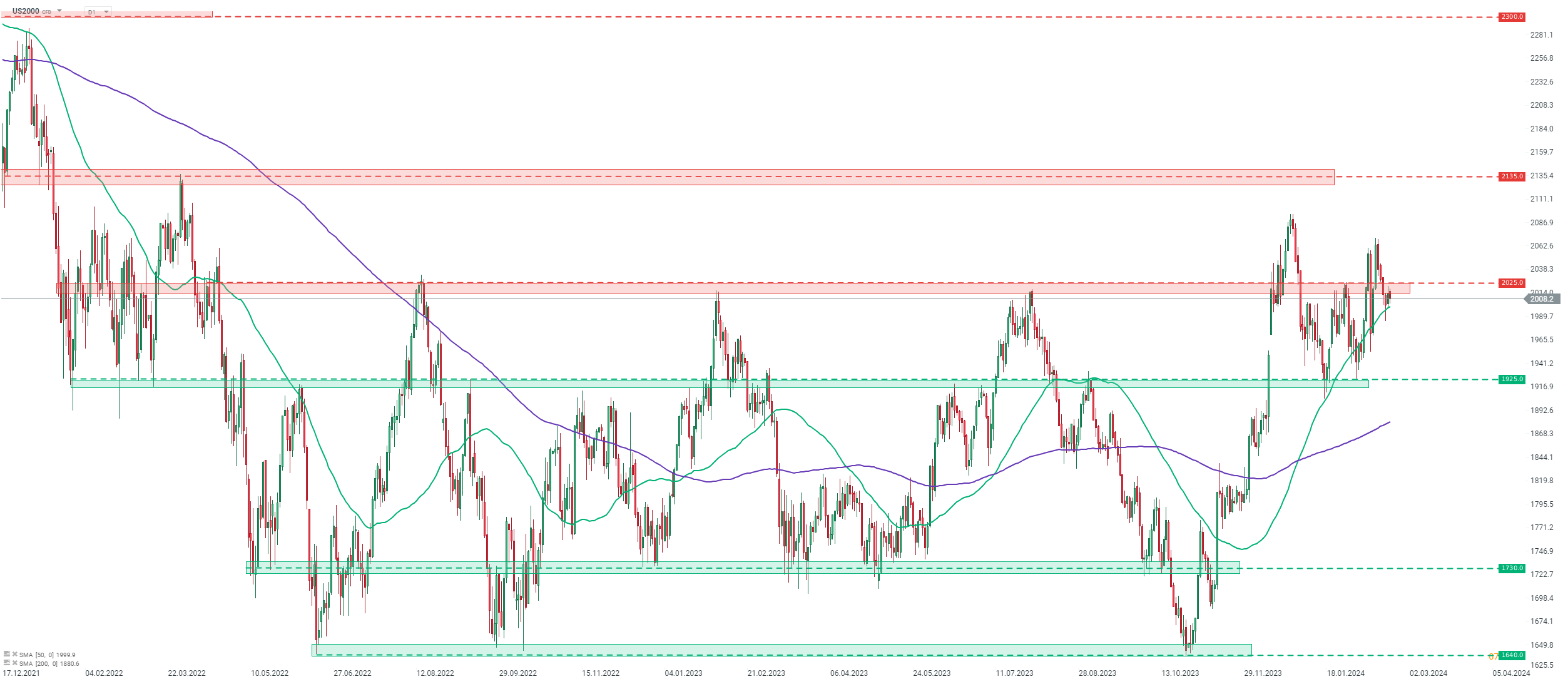 Small-cap Russell 2000 (US2000) is the only major Wall Street index to trade lower today. Taking a look at the chart at D1 interval, we can see that the index broke below the 2,025 pts price zone recently and halted declines at 50-session moving average (green line) later on. However, buyers seem to be struggling with breaking back above the aforementioned 2,025 pts zone. Nevertheless, a positive price reaction to the 50-session moving average, which has been acting as a running trendline recently, is somewhat bullish. This was the third such test this year and both previous ones were followed by a move to a fresh YTD high.