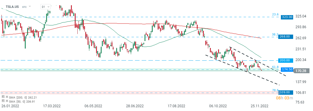 Tesla (TSLA.US) stock launched today' session lower, below key support at $174.50 which is marked with 61.8% Fibonacci retracement of the upward wave launched in March 2020. If sellers manage to uphold current momentum then downward move may deepen towards the lower limit of the wedge formation. Source: xStation5