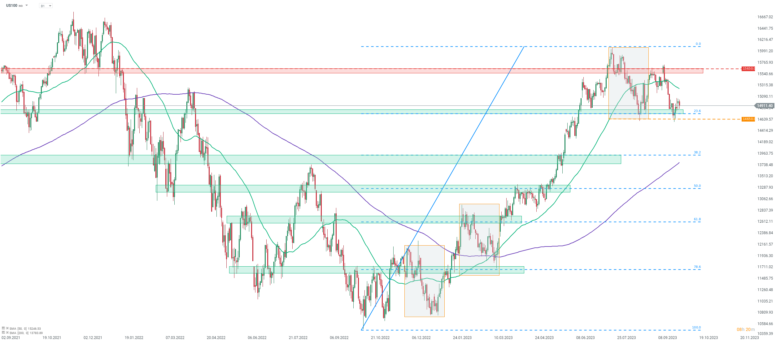 - US100 slides back below 15,000 pts mark