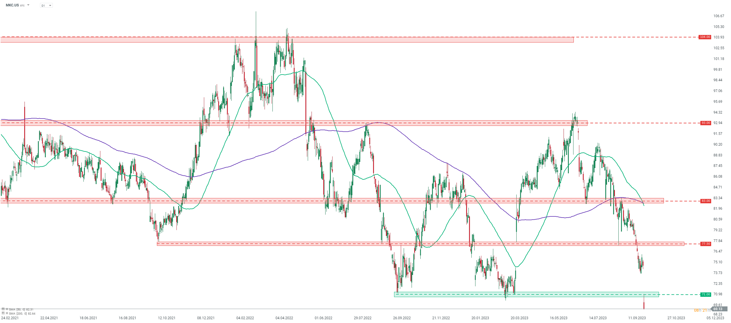 McCormick (MKC.US) launched today's trading around 5% lower after reporting a disappointing fiscal-Q3 earnings report. Stock is breaking below the $71.00 support zone, marked with lows from September 2022 and March 2023, and trades at the lowest level since Q1 2020. Source: xStation5