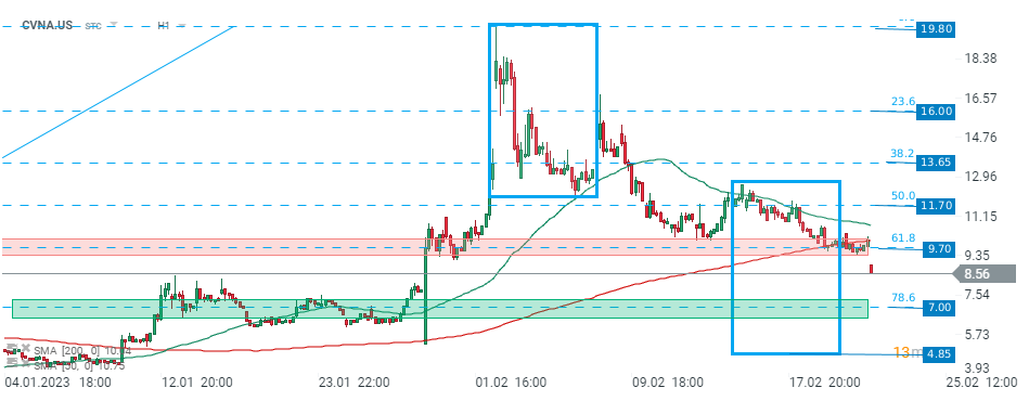 Carvana (CVNA.US) stock launched today's session with a massive bearish price gap and if current sentiment prevails downward move may accelerate towards local support at $7.00, which coincides with 78.6% Fibonacci retracement of the last upward wave. Source: xStation5