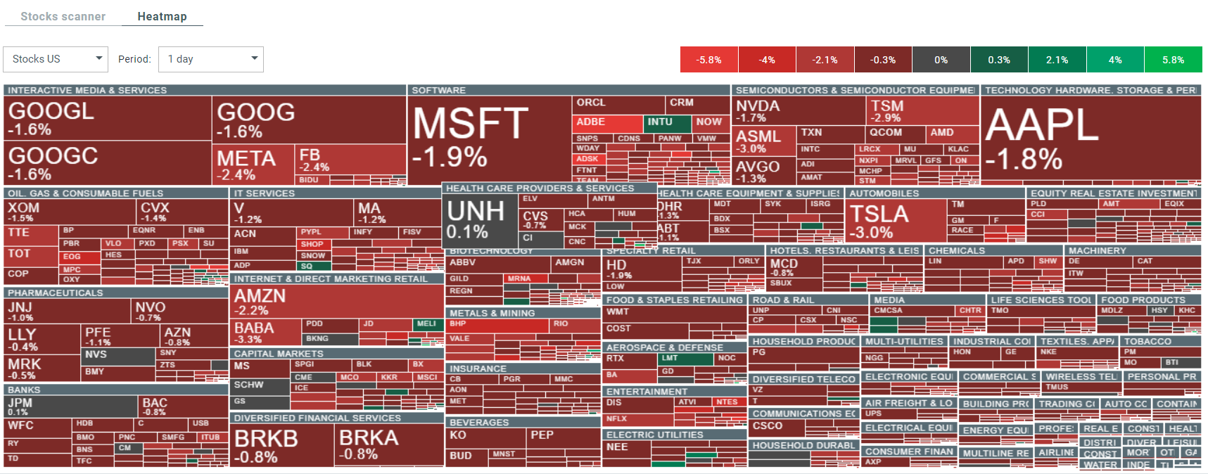 S&P 500 index stocks categorized by sectors and industries. Size represents market cap. Source: xStation5