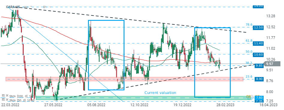 Cara Therapeutics (CARA.US) stock launched today's session with a massive bearish price gap below major support at $8.90 and lower limit of the triangle formation. If current sentiment prevails, recent lows at $7.35 may be at risk. Source: xStation5