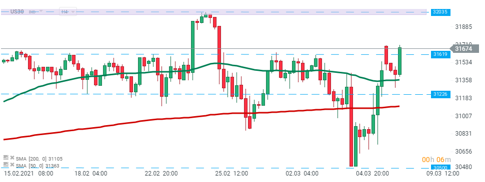 US30 bounced off the 50 SMA (green line) early in the session and managed to break above major local resistance at 31619 pts. If buyers manage to uphold momentum, then all-time high at 32035 pts may be at risk. On the other hand, if sellers will manage to regain control, then another downward impulse towards support at 31226 pts could be launched. Source: xStation5