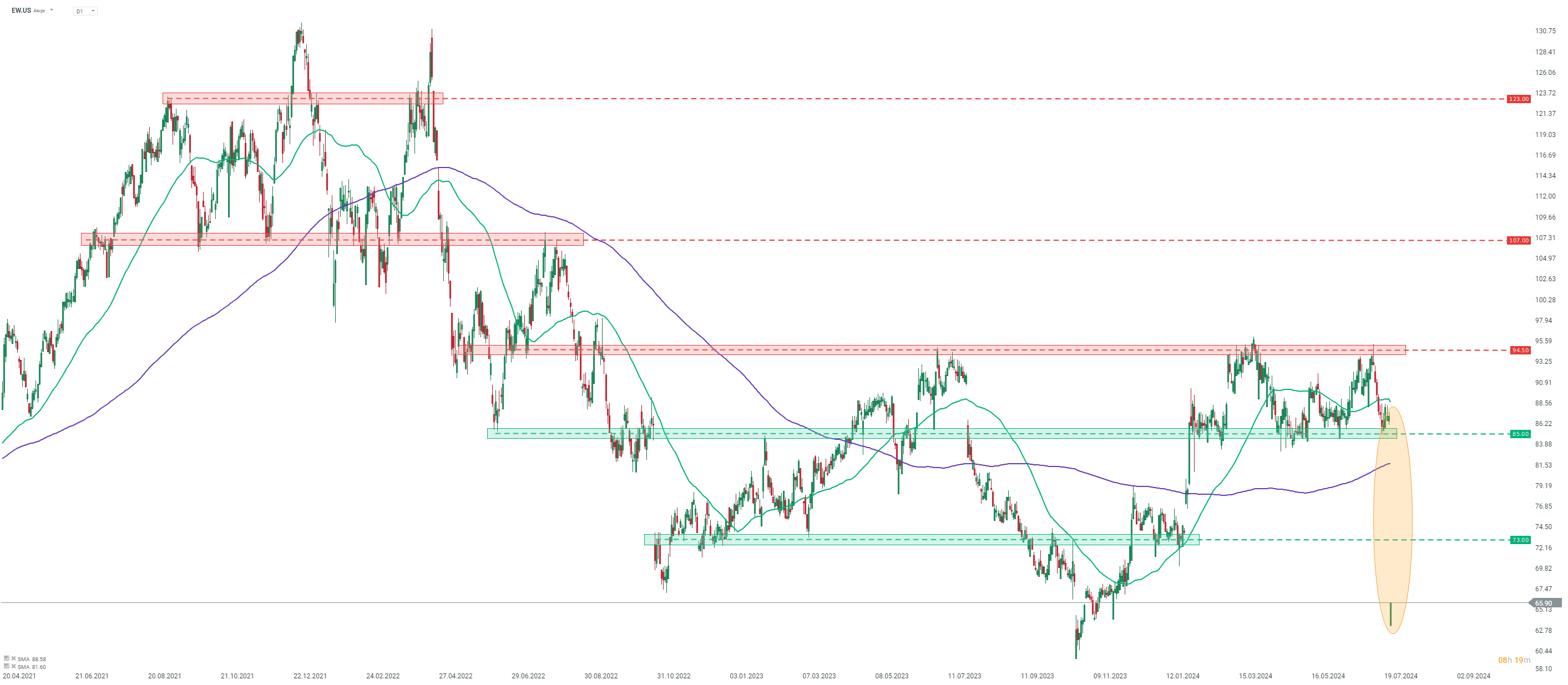 Edwards Lifesciences (EW.US) slumped after big Q2 sales miss. Company launched today's trading around 25% lower and trades at the lowest levels since November 2023. Source: xStation5