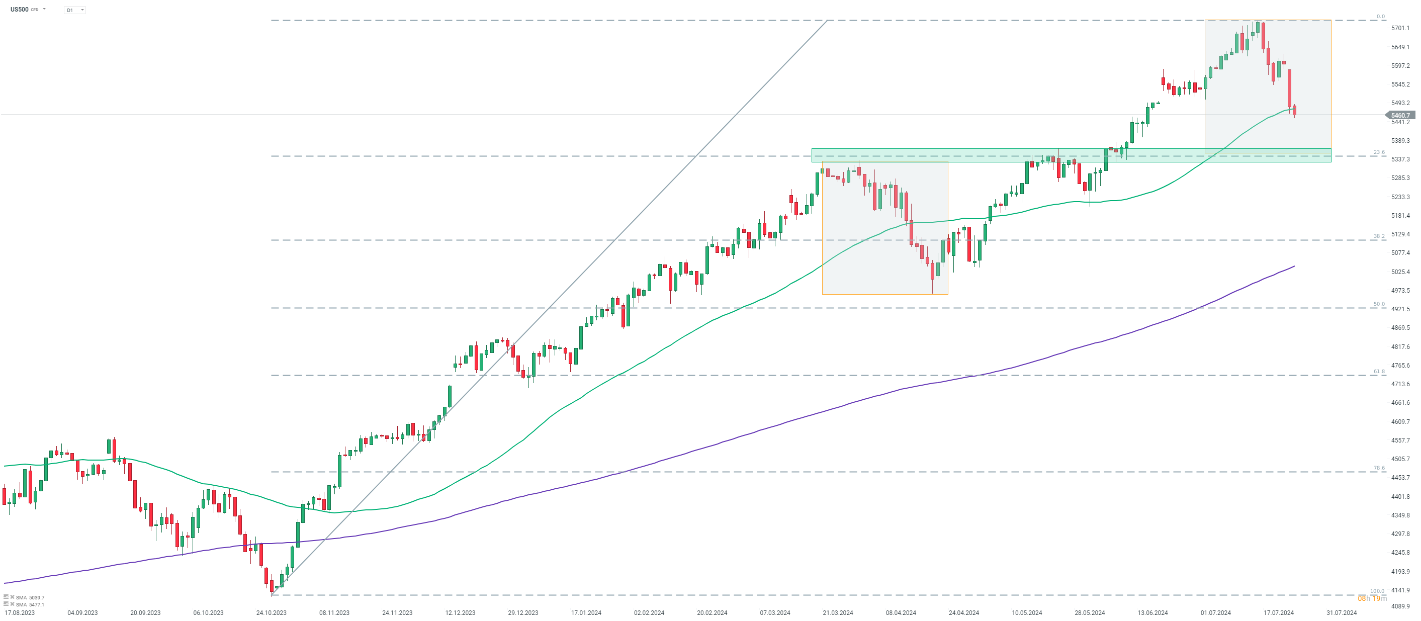 Wall Street indices are not allowed to catch a breath after yesterday's sell-off, with major US benchmarks failing to launch a recovery move. Taking a look at S&P 500 futures chart (US500) at D1 interval, we can see the index trade lower today, but the magnitude of the move is nowhere near that from yesterday. Index is making a break below the 50-session moving average (green line) today. However, according to Overbalance methodology, as long as the price stays above 5,350 pts area, where the lower limit of market geometry and 23.6% retracement can be found, the main trend remains bullish.