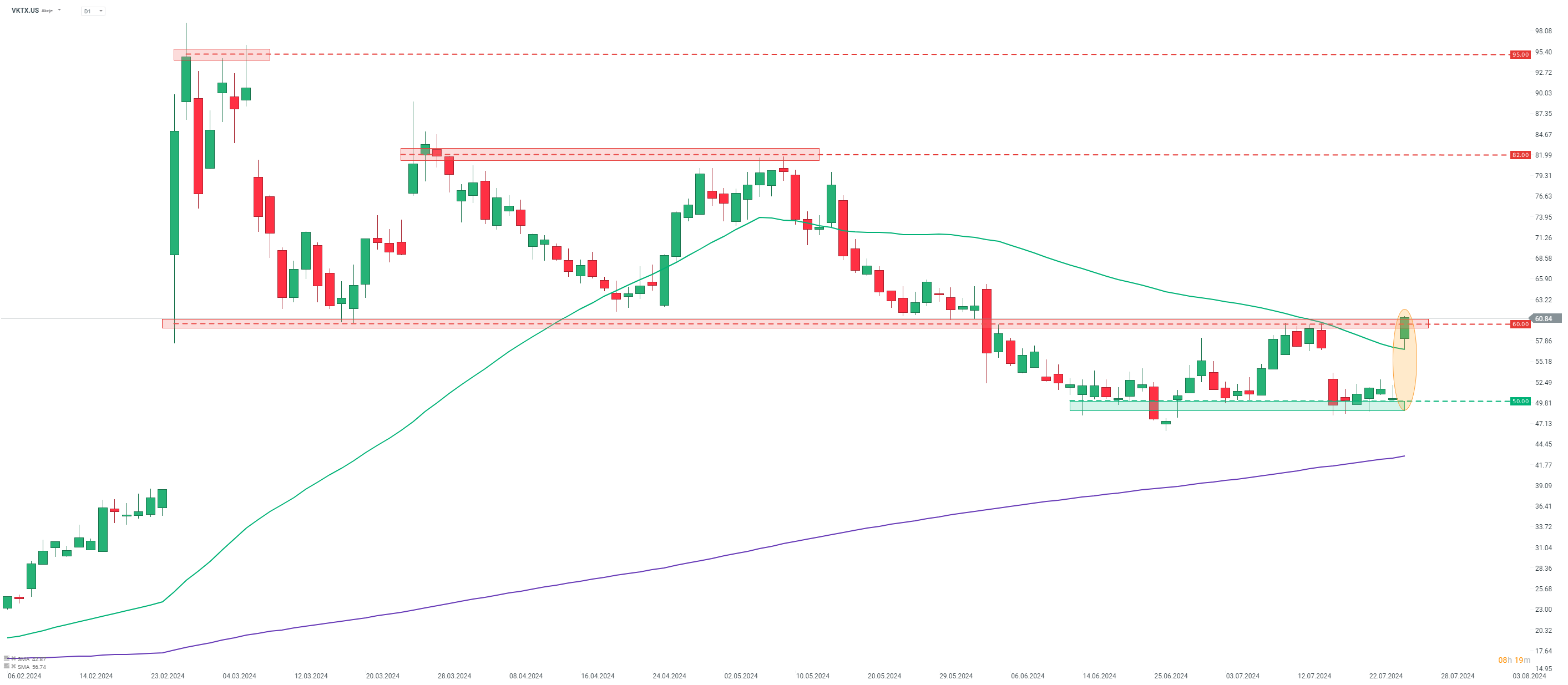 Viking Therapeutics (VKTX.US) launched today's trading with a big bullish price gap. Stock rallies after Q2 earnings releases and is trading around 17% higher on the day. Bulls are now testing $60 resistance zone. Source: xStation5