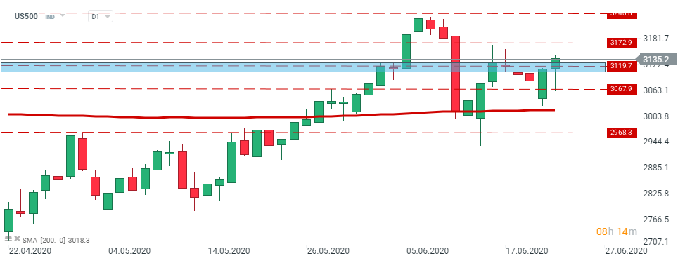 S&P 500 (US500) managed to break above 3119.7 pts zone. Should upbeat moods prevail, resistance at 3172.9 may come into play. Source: xStation5