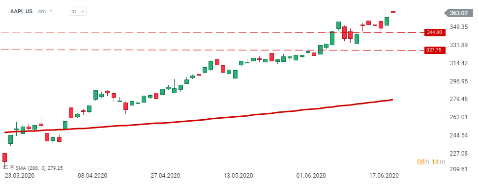 Apple (AAPL.US) stock recently hit an all-time high. If market sentiment changes then local support is located at $344.80 per share. In case downward impulse accelerate, then support at $ 327.75 per share may be at risk. Source: xStation5