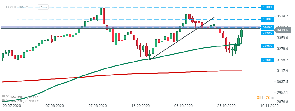 US500 – index broke above the major resistance at 3400 pts and is approaching next resistance at 3440 pts. Should a break above occur then upward move toward 3500 pts may accelerate. However if sellers will manage to regain control then support at 3305 pts may be at risk. Source: xStation5