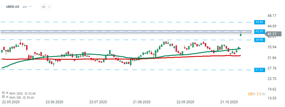 Uber (UBER.US) launched today’s session with a bullish price gap and is currently approaching local resistance at $42.25. Should buyers manage to uphold momentum then next resistance at $45.83 may come into play. However, if there is a change in market sentiment then nearest support is located at $38.90. Source: xStation5