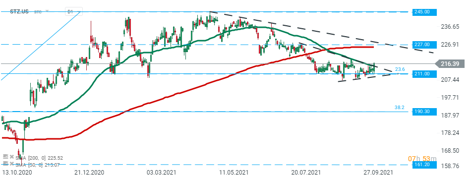 Constellation Brands (STZ.US) stock launched today’s session slightly higher and is approaching the upper limit of the triangle formation. Should a break higher occur, then upward move may accelerate towards resistance at $227.00 which coincides with 200 SMA (red line) and downward trendline. On the other hand, if sellers manage to break below the lower limit of the triangle formation which is additionally strengthened by 23.6% Fibonacci retracement of the upward wave launched in March 2020, then support at $190.30 may be at risk. Source: xStation5