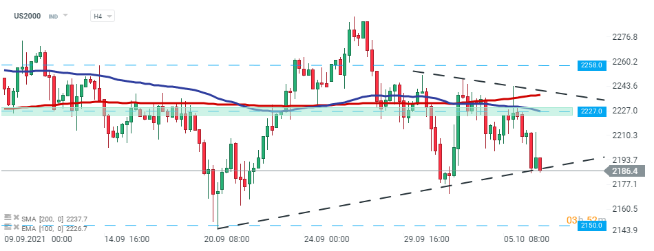 US2000 fell sharply at the beginning of today’s session, however buyers managed to halt declines at the lower limit of the triangle formation. If current sentiment prevails then upward move may accelerate towards major resistance at 2227.0 pts. However, if sellers manage to regain control and break below the aforementioned lower limit of the triangle formation, then downward move may be extended to the support at 2150 pts. Source: xStation5