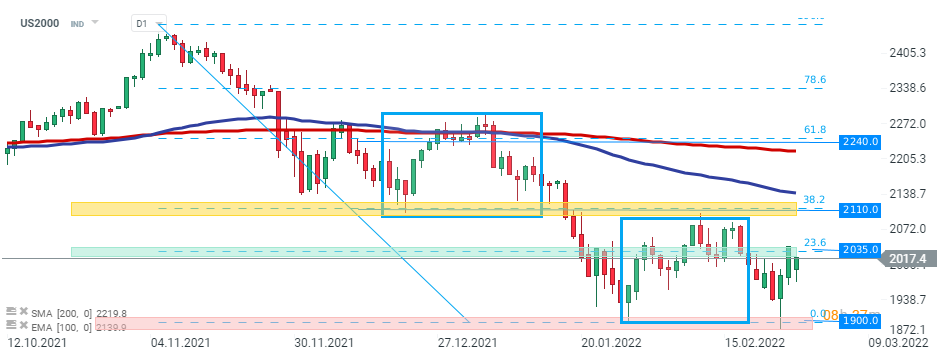 US2000 launched today's session lower, however buyers managed to erase early losses and index is approaching local resistance at 2035 pts which coincides with 23.6% Fibonacci retracement of the last downward correction. Should a break higher occur, next target for buyers is located around 2110 pts. Nearest support lies at 1900 pts. Source: xStation5