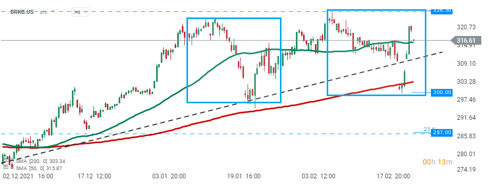 Berkshire Hathaway (BRKB.US) stock launched today's session slightly lower, not far from the all-time high at $326.30 which is marked with the upper limit of the 1:1 structure. If sellers manage to regain control, then downward move may accelerate towards long-term upward trendline. Source: xStation5