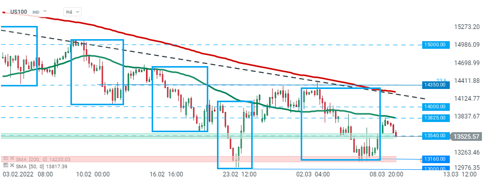 US100 pulled back after a failed attempt of breaking above the resistance zone around 13825 pts, which is strengthened by 50 SMA (green line). Currently the index is testing local support at 13540 pts. Should break lower occur, downward move may accelerate towards 13160 pts which is marked with lower limit of the 1:1 structure and previous price reactions. Source: xStation5