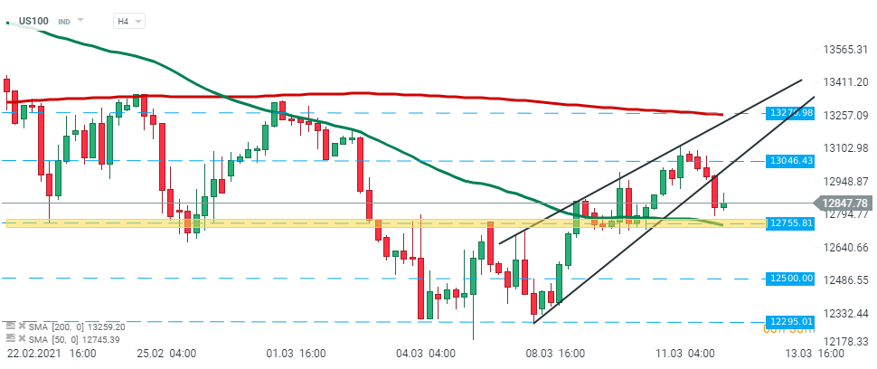 US100 broke below the lower limit of the rising wedge formation and is currently approaching support at 12,755 pts which coincides with 50 SMA ( green line). If buyers will manage to halt declines there, another upward impulse towards resistance at 13,046 pts may be launched. However, should a break below the support occur, downward move may accelerate. Next support lies at 12,500 pts. Source: xStation5