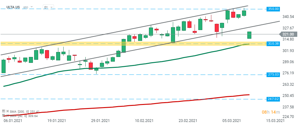 Ulta Beauty (ULTA.US) - yesterday buyers failed to break above the upper limit of the ascending channel and stock launched today's session with a bearish price gap. Price is approaching major support at $310.38 which is additionally strengthened by 50 SMA (green line). Should a break lower occur, then the next target for sellers is located around $275.03. On the other hand, if buyers will manage to halt declines, then another upward impulse toward lower limit of the channel could be launched. Source: xStation5