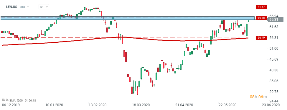 Lennar (LEN.US) stock price jumped based on better than expected quarterly results and is heading towards local resistance at $66.18 per share. If buyers manage to break above it, an upward impulse towards $71.47 per share could be launched. On the other hand, once sellers regain control, the support at $56.49 per share may be at risk. Source: xStation5