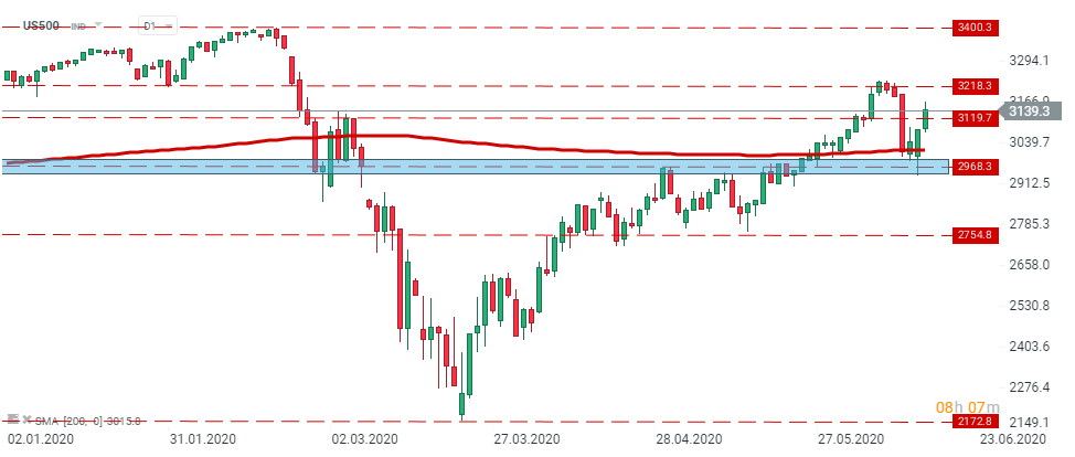 S&P500 (US500) managed to erase yesterday early losses and soared higher. Today index break above the local resistance 3119.7 pts. Should upbeat moods prevail, resistance at 3218.3 pts may come into play. Source: xStation5