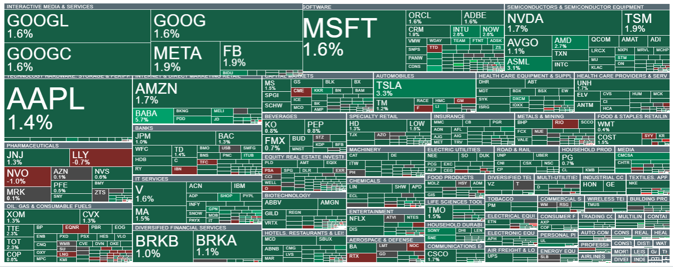 S&P500 companies, size reflects market capitalization. Optimism is widespread in the market today. Source: xStation5