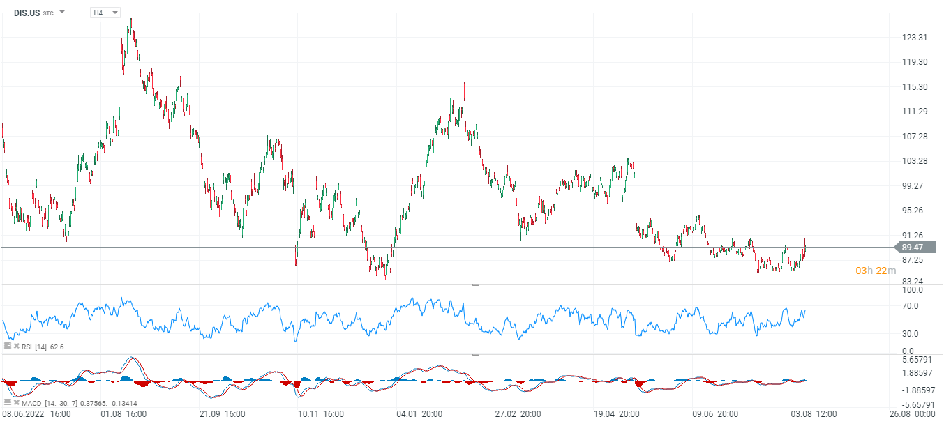 Disney (DIS.US) shares are up 2% even though the company reported lower-than-forecast revenue, with earnings per share down y/y. Earnings per share fell y/y despite $500 million lower y/y cash 'burn' at Disney+ and strong results from theme parks. The number of subscriptions at Disney+ came in well below forecasts due to subscriber churn in India, where the company halted the broadcast of its popular cricket league. EPS only slightly beat forecasts. The market seems to appreciate CEO Bob Iger's contribution and is positive about cost reductions - Iger conveyed that the company may manage to save more than the expected $5.5 billion this year. Investors are also evaluating the company's decision to increase Disney+ subscriptions by 27%, and Netlix's 'inspired' plan to combat password sharing. Both decisions could herald faster streaming profitability, at the expense of lower subscriber numbers.