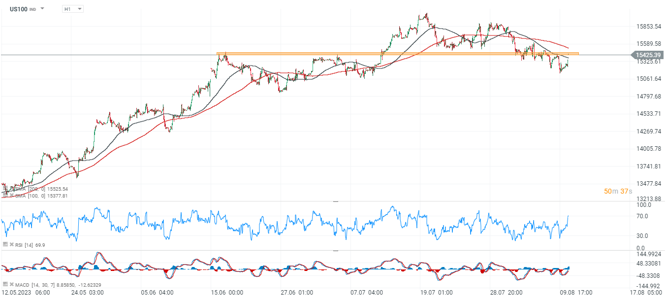 The Nasdaq100 Index (US100) managed to recover a good portion of its losses and is approaching 15,500 points, where we see the SMA200 (red line) - at the same time, the RSI indicator is approaching the overbought zone. Source: xStation5