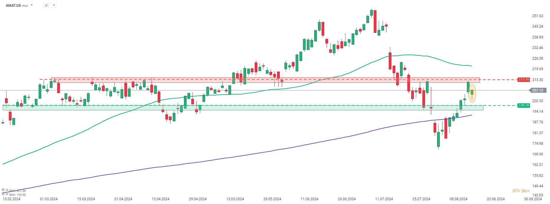 In spite of reporting rather solid fiscal-Q3 earnings, Applied Materials (AMAT.US) launched today's trading lower. However, around half of the drop has been erased already. Source: xStation5