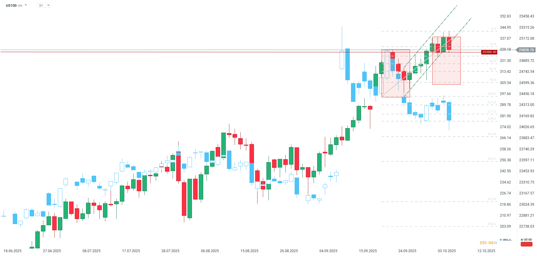 The US100 tested the 25,000 point level today, which provides additional support tied to the local peaks from September 22-23. Oracle is currently paring losses, though the price had earlier broken through the local lows from October 1st, effectively reversing roughly half of the September 10th price jump.