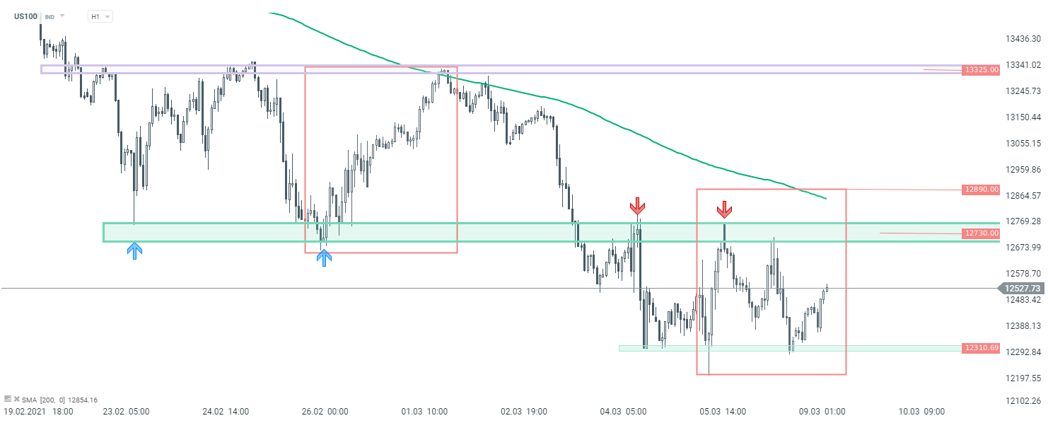 Taking a look at US100 from a technical point of view, we can see that the index bounced off the 12,310 pts swing area and launched an upward move. The nearest resistance to watch can be found at 12,730 pts and is marked with previous price reactions. However, key resistance can be found slightly higher at 12,890 pts, where the upper limit of the Overbalance structure can be found. In theory, breaking above this hurdle would signal a short-term trend reversal.