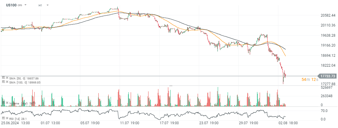The panic sentiments in the Asian session, and further downward pressure in Europe, has investors across the Atlantic feeling uncertainty; some are choosing to sell assets before Wall Street opens, sending Nasdaq 100 futures (US100) almost -4.5% lower. Concerns about a recession, with treasuries yields still historically high and stocks from the Nasdaq 100 and S&P 500 highly valued, are putting pressure to realize gains and retreat from Wall Street. High expectations for companies' revenue, profit and margin growth in the second half of the year are being revised downward as US data signal a serious and unexpected cooling of the labour market and increasingly weakening economic conditions.