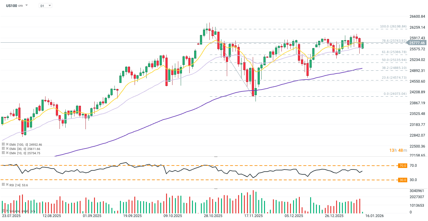 Yesterday’s sell-off in US100 halted before 61.8 Fibonacci retracement level of the Oct-Nov. 2025 selling wave. The contract closed at EMA30 (light purple), set for a successful rebound from the beginning of European trading. The gains are currently capped by the 78.6 Fibo level and could either accelerate or stall in the face of further bank earnings later this session. Source: xStation5
