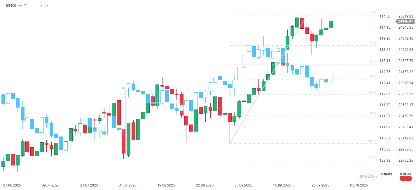 The US100 is up 0.4% today, approaching the 25,000 mark and sitting just 0.3% shy of its all-time high. The contract has fully reversed the decline that began yesterday evening and lasted until the start of the European session. Furthermore, gains on the Nasdaq 100 futures accelerated sharply upon the opening of Wall Street today.