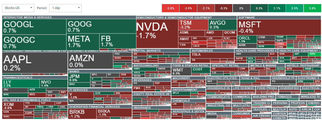 Most U.S. companies are down today; oil and gas, insurance, and semiconductors and software sectors are performing poorly. Shares of obesity drug makers Eli Lilly (LLY.US) and Novo Nordisk (NVO.US) are gaining. Source: xStation5