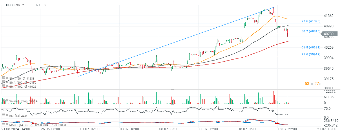 Looking at the DJIA (US30) contracts, we see record selling since the last roll-off in June; the index has retreated below the key momentum averages SMA50 and SMA100 on the hourly interval and is struggling to hold support at the 38.2 Fibonacci retracement of the upward wave from early July, at 40700 points.