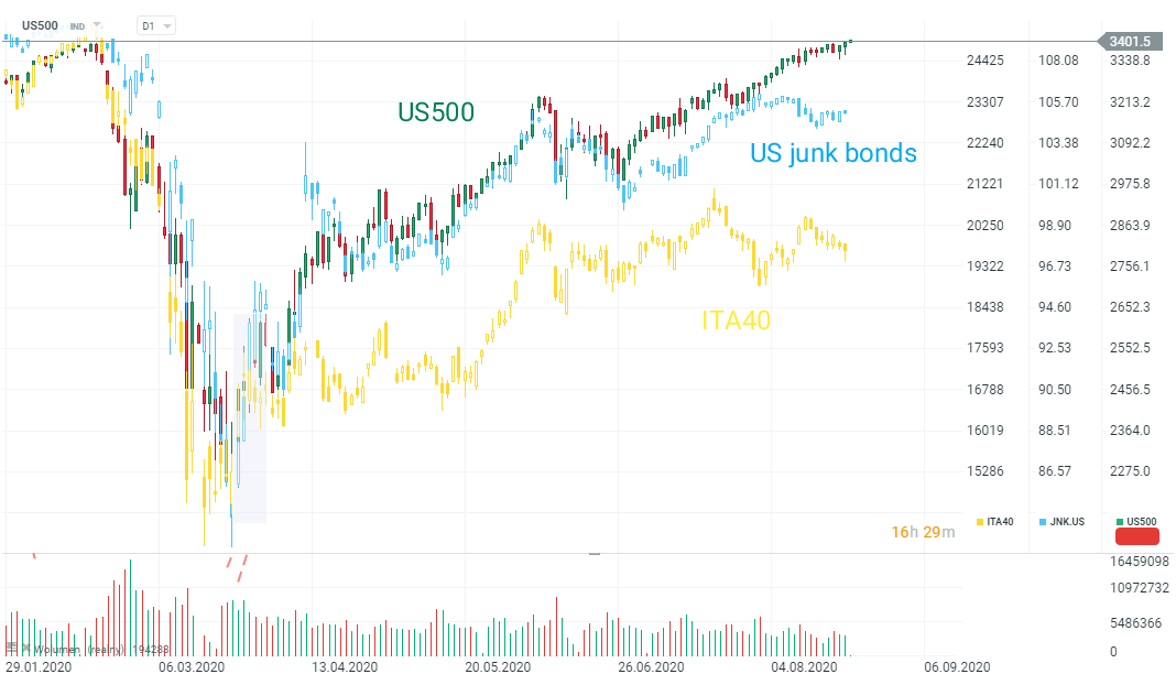 Global equities started the week higher on positive developments connected to coronavirus vaccines and treatments. The US500 index has jumped above the 3,400 pts for the first time in history today and is trading around 5.5% higher year-to-date. The US junk bond market has decoupled from the stock market after moving in tandem for the most part of post-pandemic recovery.