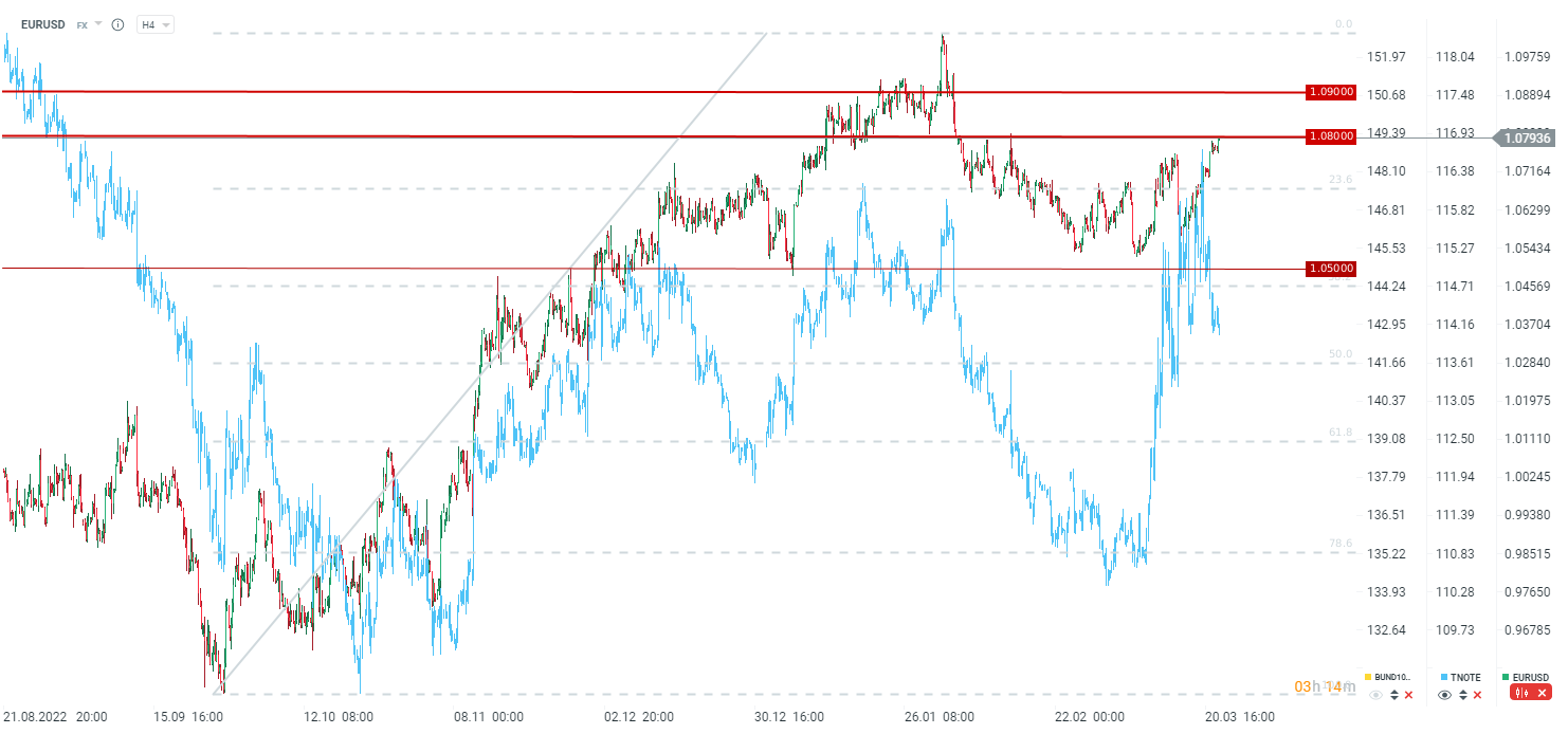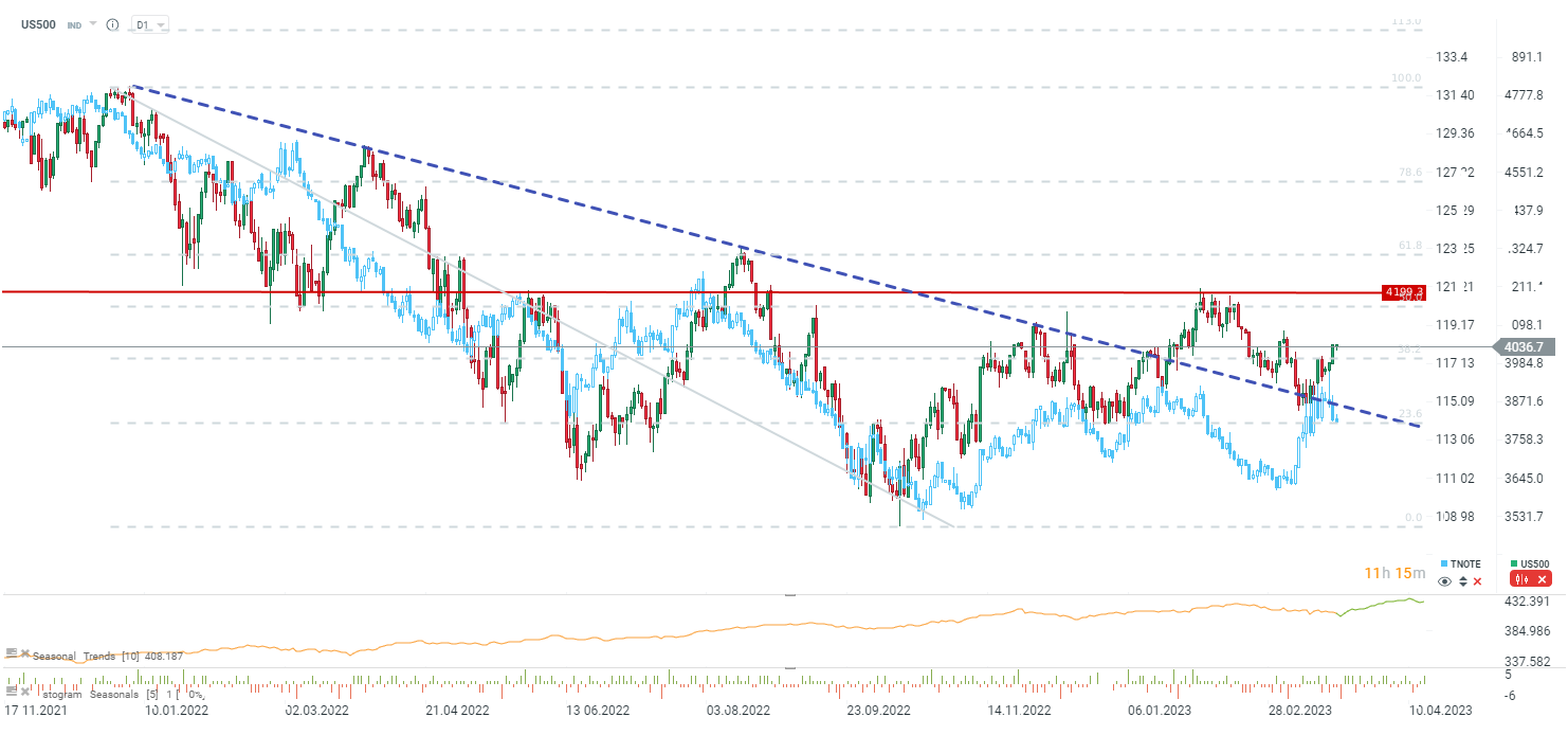 The US500 is roughly where it was just before the SNB collapse. The US500 broke the falling trendline in January and tested it again on March 10. There was speculation that a so-called "bull market trap" may have been set. Keeping the US500 above the falling trendline, however, may negate such expectations. Nevertheless, it is crucial for the bulls to break 4200 points, which could happen if the forward rate is kept unchanged and the assumptions of the balance sheet reduction program are changed. However, if the Fed maintained a sharp hawkish stance (raising the rate forecast and maintaining QT). Then the area around 3800 points could be tested.
