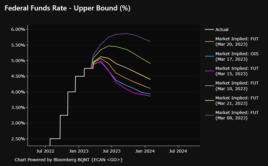 As recently as March 8, the market speculated that the Fed could raise by 50 basis points in March, and the forward rate could exceed 5.5% (this was the baseline scenario). The collapse of SVB and the takeover of Credit Suisse changed everything in the market. Although the crisis seems to have been averted this risk could theoretically return with redoubled force, which could repeat the 2008 crisis.