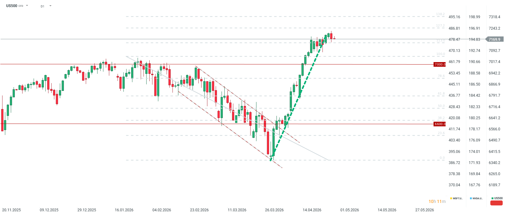 The US500 is undergoing a sharp correction during the April 28 session. Today, volatility will be fueled not only by the Fed's decision but also by US corporate earnings. After the Wall Street session today, we will see results from Microsoft, Alphabet, Amazon, and Meta. Disappointment in these results could send the S&P 500 index contract below the 7,000-point level, whereas showing a real, strong return on AI investment could send the US500 not only above 7,200 but toward the 7,300 area at the 138.2 retracement. Nevertheless, it must also be remembered that sentiment on Wall Street may still depend on what Donald Trump says, even though investors have been focused on the future for a month now. Source: xStation5