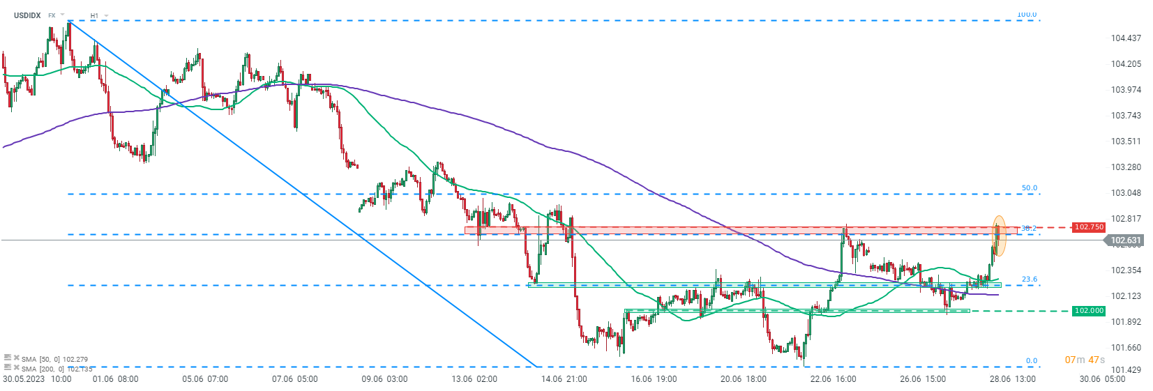 Taking a look at USD index (USDIDX) at H1 interval, we can see that the index has once again attempted to break above the resistance zone ranging between 102.75 mark and 38.2% retracement of downward impulse launched in late-May. Bulls failed to push the index above and a pullback can be observed at press time (orange circle on the chart below). A potential double top was painted on the chart and should USDIDX continues to slide, traders should watch 102.00 as the neckline of the pattern. A break below this area could hint that a deeper drop is looming.