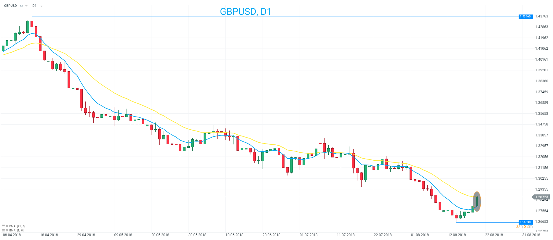 GBPUSD has moved firmly higher today and the market is now retesting the 21 EMA on a D1 chart. The market remains in a longer term downtrend as shown by the orientation of the 8 and 21 EMAs. Source: xStation