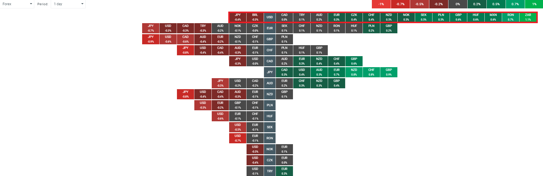 The USD is trading lower on the day against all its peers barring the JPY and BRL. EM currencies are the best performers with the USDZAR lower by more than 1% on the day. Source: xStation